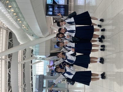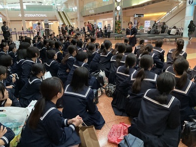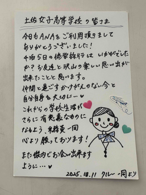 修学旅行の往復はANAを利用しています。毎年、機内アナウンスで本校生徒へのメッセージをいただき、搭乗している生徒たちにとって、驚きと喜びを感じる時間となっています。今年の帰りの便では、アナウンス後、メッセージカードまでいただき、あらためて「おもてなし・気遣い」について考える機会となりました。