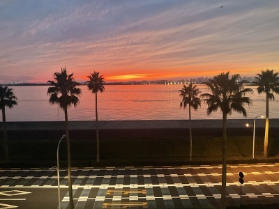 [朝焼けの中ターミナルが開くのを待ちます]